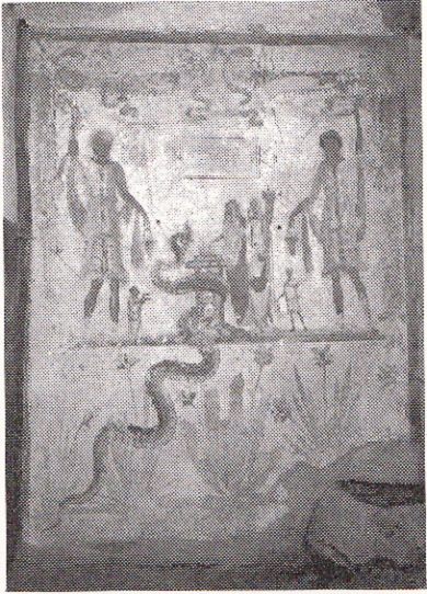 その証拠に 後世ニシキヘビの頭が何者かによって削り取られている。 へび民族に敵対する民族の行いと推測する。高松塚古墳の玄武といったところでしょうか。