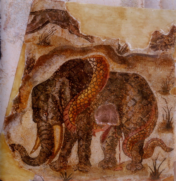 なだらかに傾斜した丘を背景に、散在して生える植物にとりかこまれながら、ゾウが獰猛なニシキヘビに攻撃されている。ニシキヘビは、ゾウの脇腹に絡みつき、腹部からは血が滴り落ちている。このパネルは、狩猟をテーマとした大舗床モザイクの一部であり、本来、狩猟場面だけでなく、狩人や狩りのための準備の場面が描かれていた。[A.B.A]