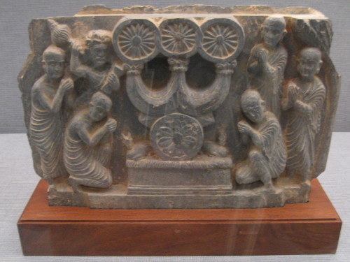 | ガンダーラの浮彫りとしては極めて珍しい資料である。右端に釈迦牟尼仏陀立像、左は三段にわたり、上から化粧する貴婦人、化粧後の女とその夫(性愛を暗示)、二人の子供が描写されている。特筆すべきは、婦人が手にする手鏡(把手が円盤裏に直径のように水平に付いているのが特色)で、これはローマ帝国から輸入されたものだと考えられる。一方、展示されている別の手鏡(展示目録No.20)は、インド系である。恐らく、仏陀と男女の性愛を暗示する事により生天、彼岸、極楽の楽しさを在家仏教徒に教えているのであろう。 |