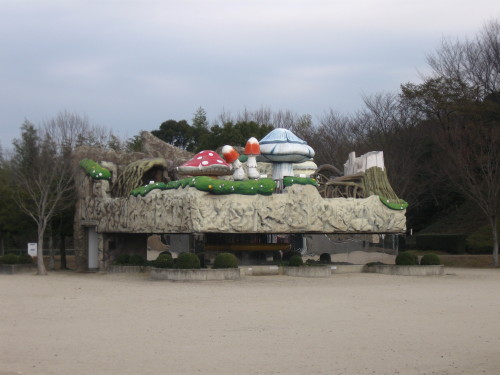 左に美術館、大きな運動場を中央、右にキノコの森 |