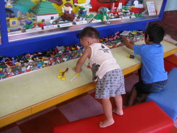 室内で楽しめます。 おもちゃを展示し、遊べるようになっています。左写真はダイアブロックで遊ぶ巳好樹隊員ですが、ほかに”シルバニアファミリー””プラレール””リカちゃん”といったおもちゃや ”ままごとハウス””まなびハウス”といったパビリオンもあり 充実しています。 |