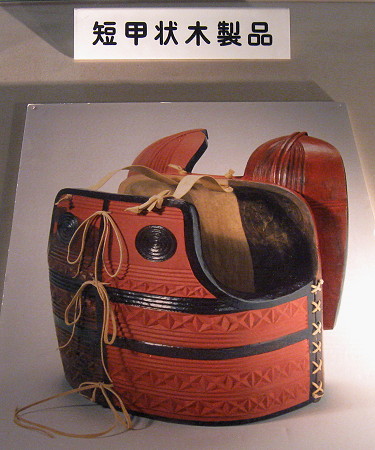 『ヤナギの木を削って模様を刻み、赤と黒色に塗り分けた甲の背当ての約半分です。