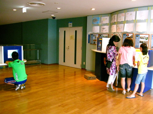 ちなみに ハリセンボンも沖縄などでは食用にするようです・・・。 バフンウニとナマコは2Fの開放実験室にて。この日の開放実験室では”アサリは海水の水を浄化するのか?” ”潮の満ち引き”などの実験をすることができました。 |