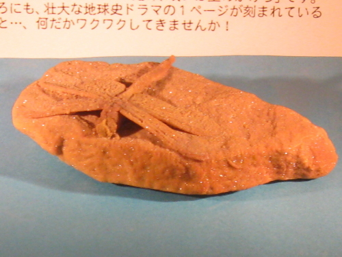この標本はアラビトセラスという白亜紀末期の退化型のアンモナイトである。この標本は赤色部が欠けているが、全体としてS字型をしている。
