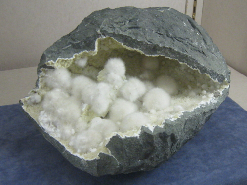 火山岩岩漿の中で発生したガスの気孔にメノウが沈殿し方解石の結晶が穴いっぱいに晶出 |