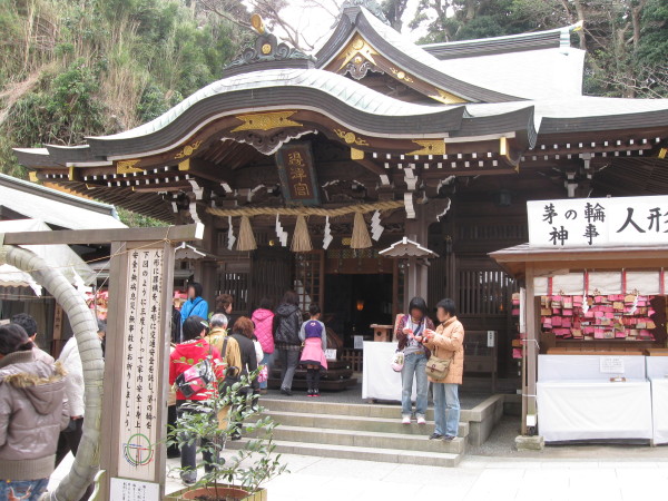 江戸時代、幼くして失明した杉山和一(杉山検校)がいました。江戸当時、山瀬検校や入江豊明などの高名な鍼師がおり、和一は鍼師をこころざします。伊勢を離れ一人江戸に旅立った和一は、日頃から弁財天に帰依しており、この江の島を訪ね、技術の上達を祈願しました。山から下りる帰り道に石につまずいて倒れてしまいました。 意識を失った和一に、五色に彩られた雲に乗って弁財天が顕れたそうです。和一は両掌を合わせましたが、何やらチクチクと体を刺すものがあって、手に取ってみると松葉が入った竹でした。 これは弁財天の思し召し-と竹筒にヒントに杉山式管鍼術を考案し、その後、将軍徳川綱吉の病気を治し関東全域の盲人を束ねる最高位・関東総検校にまで出世したそうです。そのヒントになった石が福石というわけです。 |