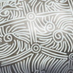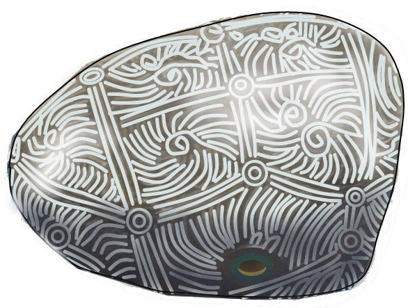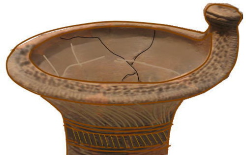 表面に直弧文をきざんだのち、黒漆をかけたもの。材料はヤブツバキ。