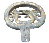 銅地に金箔を施したもの。環の内側に、玉を取り合う2匹の龍を向かい合わせにあらわしている。有力豪族の持ち物か。