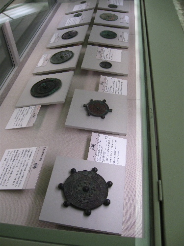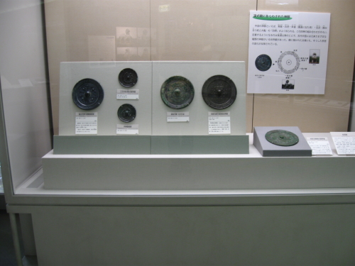 前漢(前2~前3世紀)の連弧紋縁蟠螭紋鏡(れんこもんぶちばんちもんきょう)から、和鏡である七鈴鏡(古墳時代中~後期(5~6世紀))の銅鏡を30点あまり展示している。 |