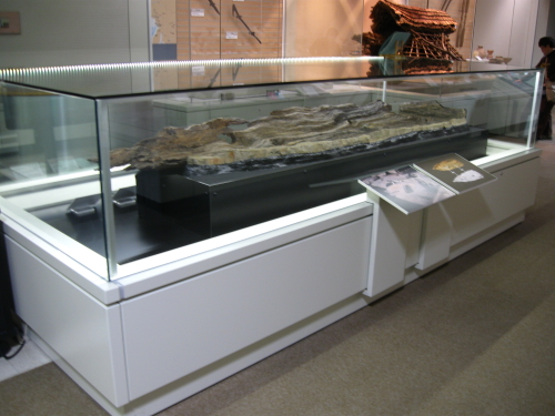 名古屋市北区平手町遺跡から平成20年に出土した船形木棺です。日本最古の「舟葬(しゅうそう)」として注目された展示物です。