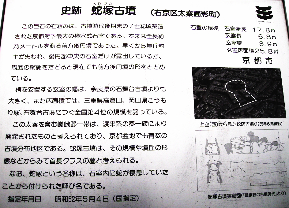 被葬者が秦氏と推測されるのも、太秦の”秦”であることと、古来から京都に住みついた秦氏が、すぐれた土木技術や機織り技術をもつ渡来系の一族で、桓武天皇による京都への遷都には秦氏の財力でバックアップするほど力があったからである。 |