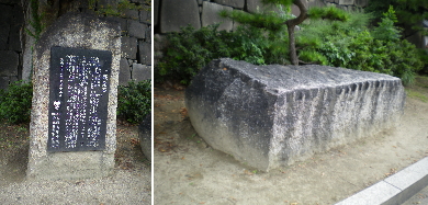 「これは徳川秀忠により1620年から始まる大阪城修復の際に香川県小豆島、黒田長政(官兵衛の長男)の石切り場で残念ながら使われなくなった石でございます。小豆島の記念事業として、昭和56年に運ばれたものです。」 |