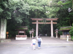 左右には、長さ16間の瑞垣(みずがき)が設けられ、ご祭神とゆかり深い動物、花鳥など、すぐれた木彫りの欄間が、はめ込まれています。三ツ鳥居、瑞垣ともに重要文化財に指定されています。 |