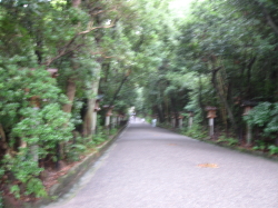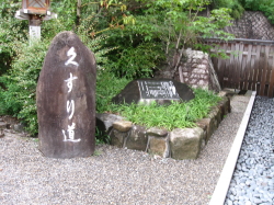 大神神社拝殿から西の祈祷殿を通り進んでいくと「久すり道」の石碑にあたる。薬道ということで参道に薬草が植えられている。
