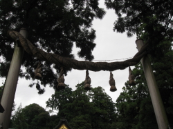 明神型鳥居を三つ組み合わせた、一名「三輪鳥居(みわとりい)」とも言われる独特の鳥居です。いつ頃どのようにして、この形式が出来たのかは不明で、神社の記録にも「古来、一社の神秘なり」と記されているだけです。