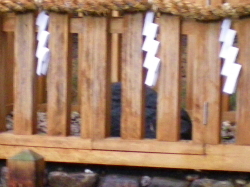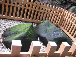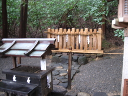 写真中央部、屋根に守られるように注連縄をまいた球形の物体がおかれているが、金属製のボタンを押す御神水が出る。