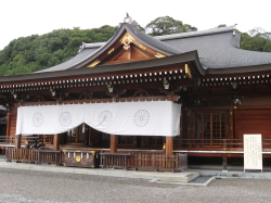 国の重要文化財となっています拝殿・三ツ鳥居の老朽化に伴う保存修理とそれにあわせて、境内諸施設の拡充整備を目的とした「平成の大造営」事業で、平成9年5月8日に竣功しました。正面に祈祷殿、左に儀式殿、右に参集殿と3つの建物が、三輪山を背に西向きに建ちます。使用されている木材は、大部分が台湾檜で、一番太いものは樹齢1500年の原木から用いられています。 |