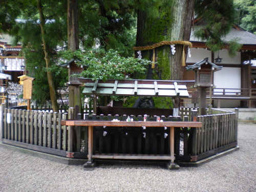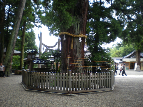 | 三輪の大神のあらわれた杉、神の坐す杉とされていました。しるしとは、示現のことで、当初、神杉として信仰されていたすべての杉のことを指していました。この杉も覆屋が作られ、根本だけが残っています。 |
