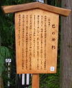 江戸時代には、「雨降杉」とあり、雨乞いの時に里の人々が集まり、この杉にお詣りをしました。いつの時代からか、杉の根本に、巳(み)さん(=蛇)が棲んでいるところから、「巳の神杉」と称せられるようになり、巳さんの好物とされる卵が、酒とともにお供えされています。